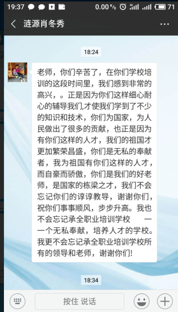 部分学员给予老师们的肯定 “扶贫”一直是国家关心的民生问题,我校也一直响应党的号召,稳扎稳打的做好实事,给那些真正需要的人尽最大的力量带去知识和技能,在以后的扶贫路上我们是哪里需要哪里走,希望能真正的帮助到更多的人! |